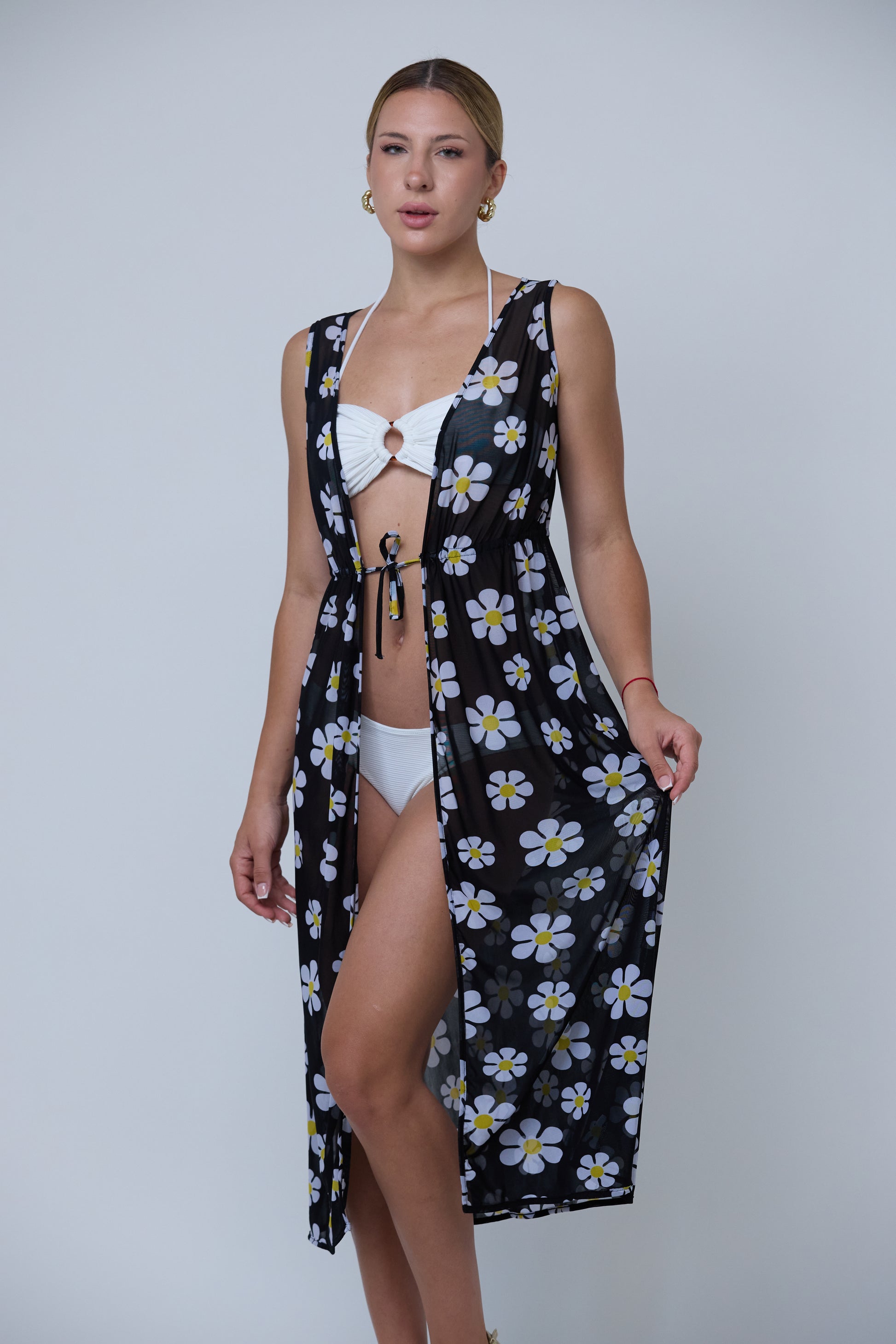 Playful and airy — floral with charm. Flora is a sheer black mesh cover-up adorned with bold daisy prints and a waist tie. Lightweight and breezy, it adds a touch of fun to any swim look — perfect for sunny strolls or beachside lounging.