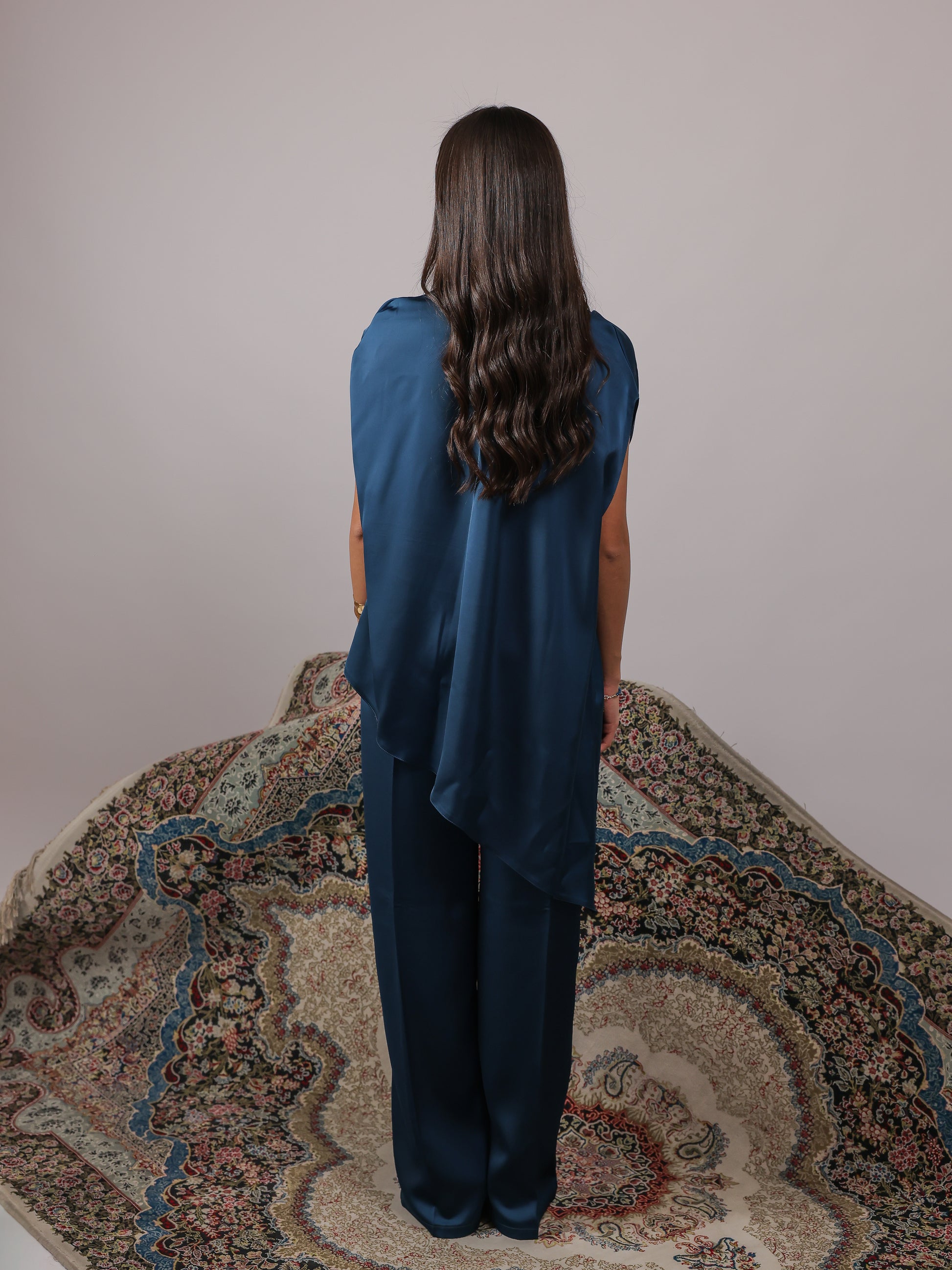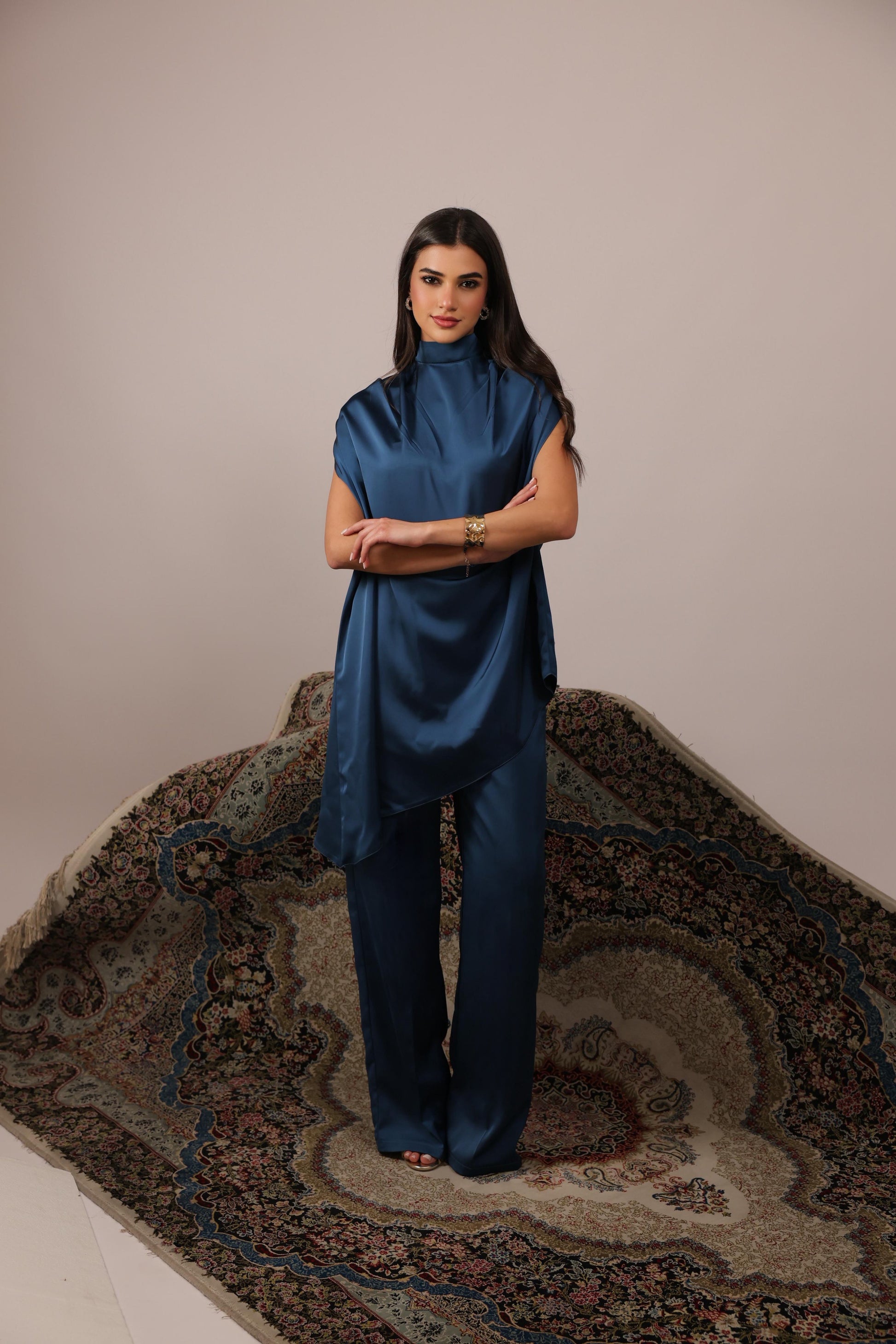 Asymmetrical satin top with satin pants ( elastic from the back with a side zipper)