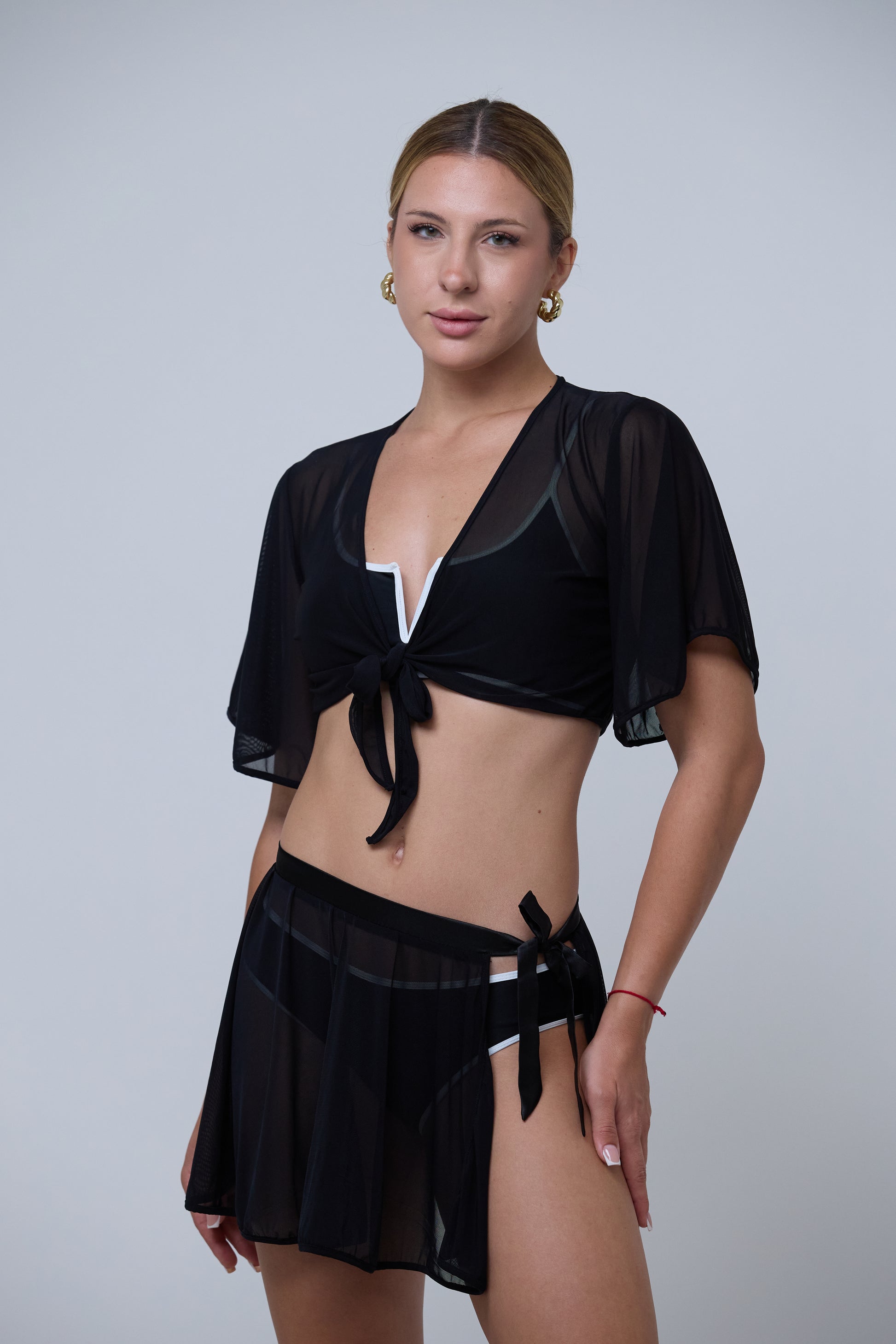 Sheer and refined — light with allure. Vela is a flowy chiffon two-piece black cover-up set featuring tie-front top and a matching wrap skirt trimmed with soft satin. A sleek layering essential — effortless, elegant.
