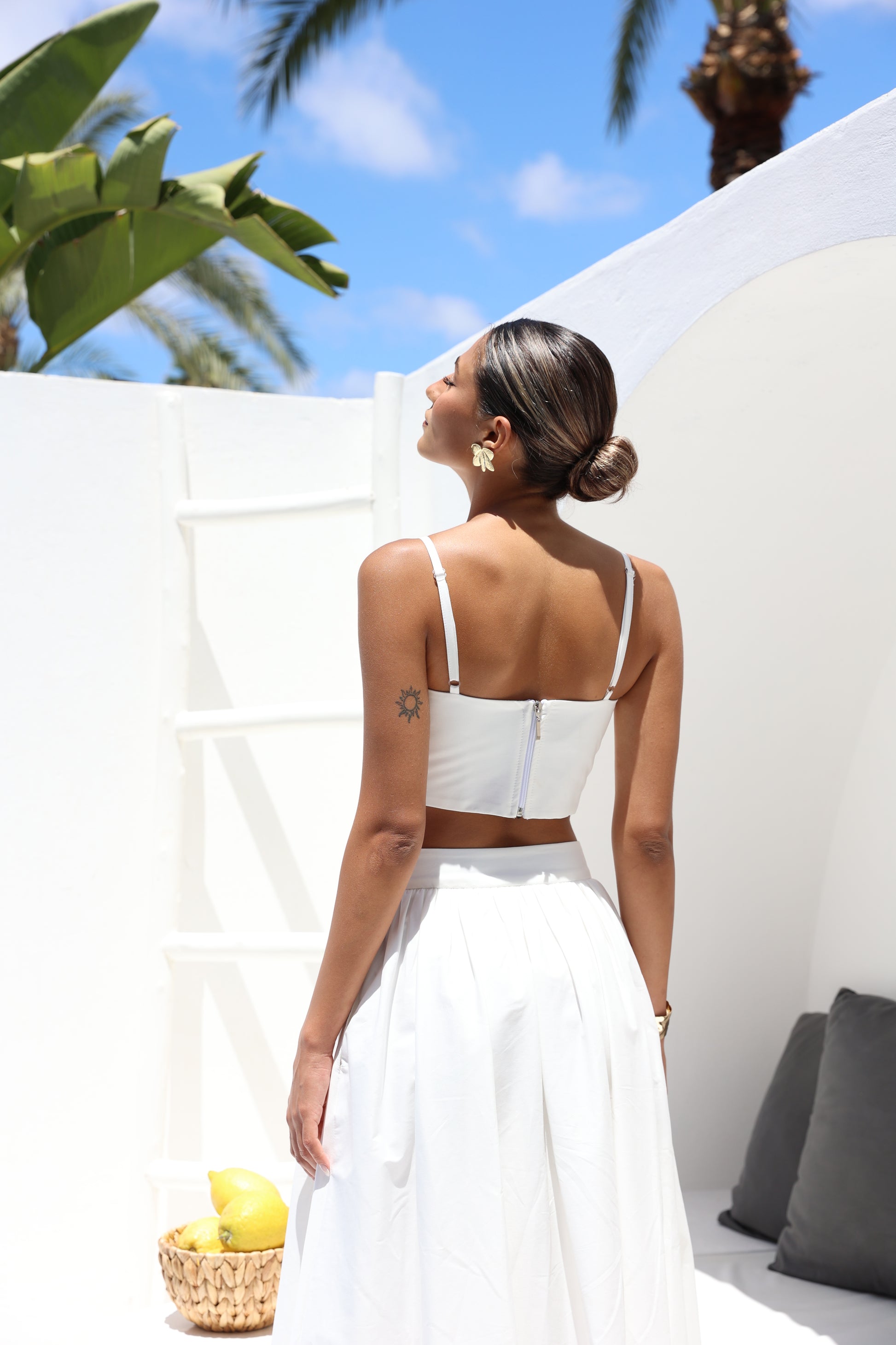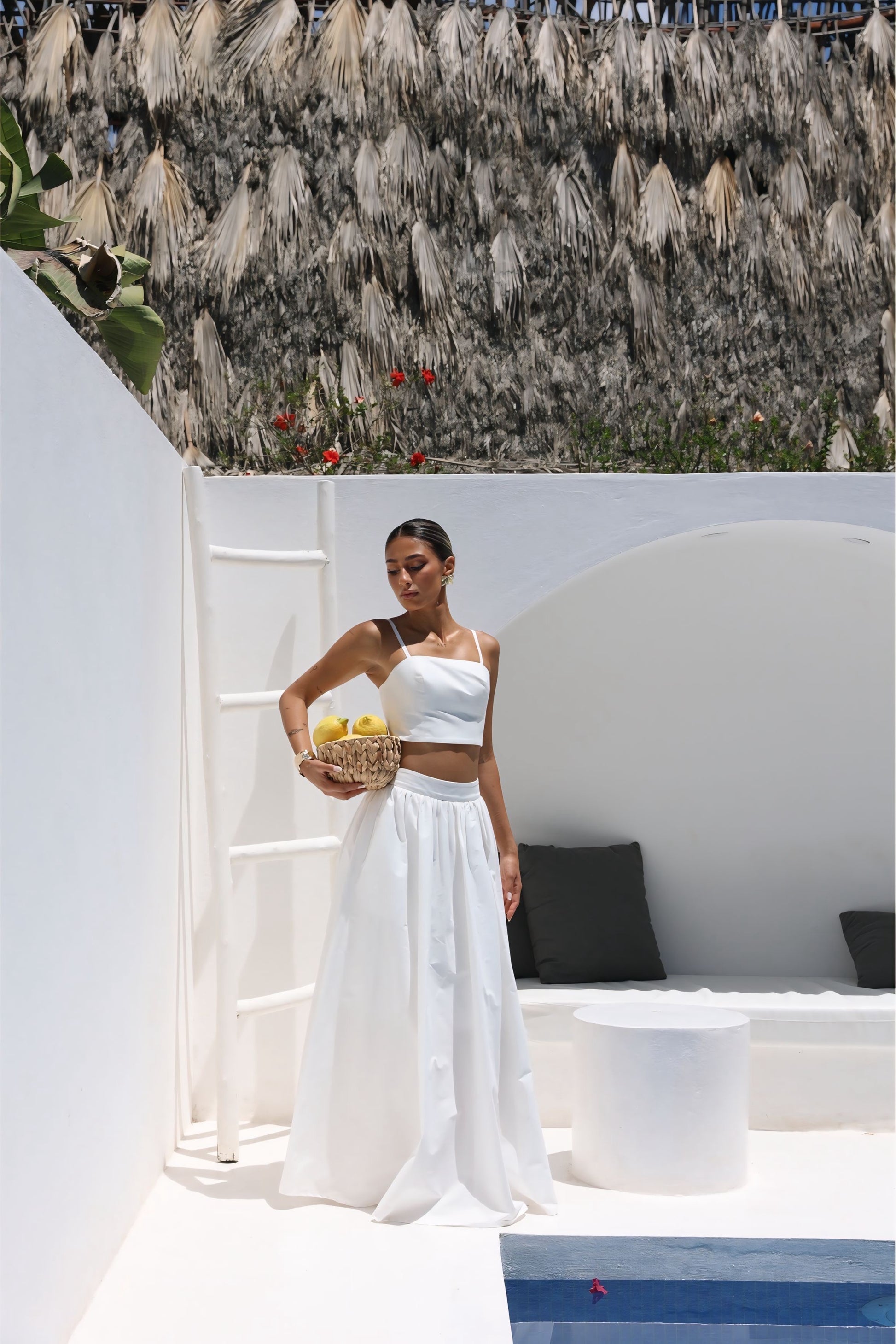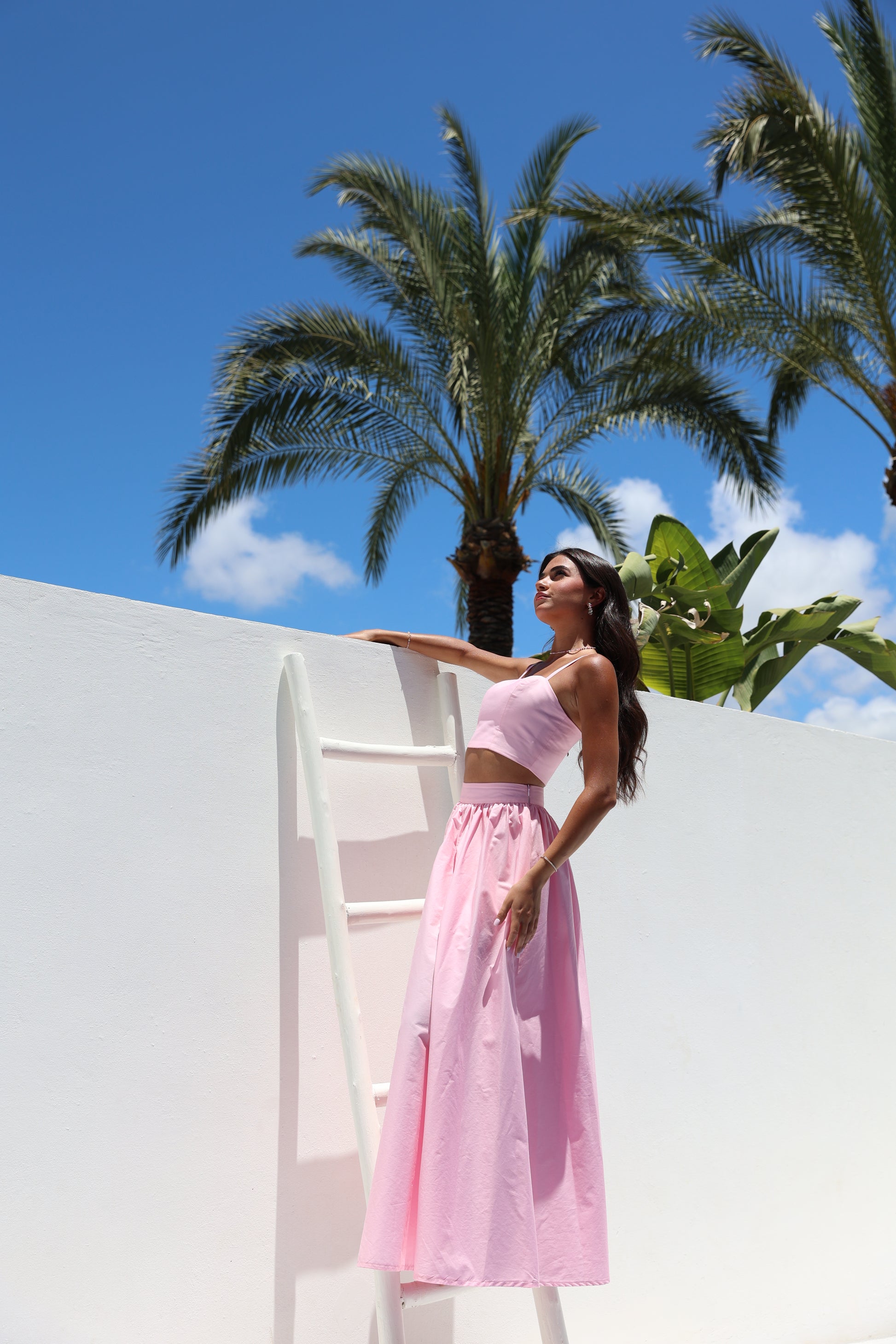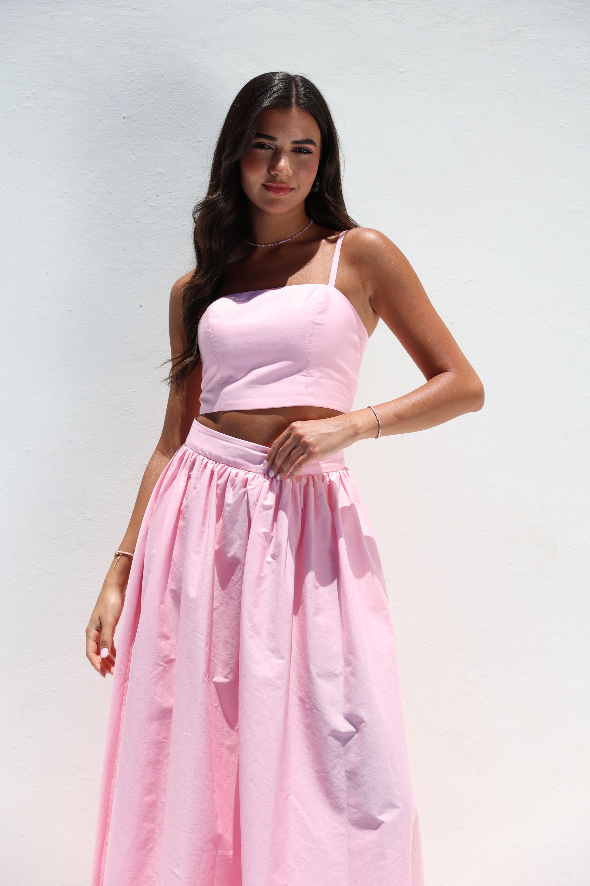 - Includes a flowy maxi skirt and a structured corset-style crop top