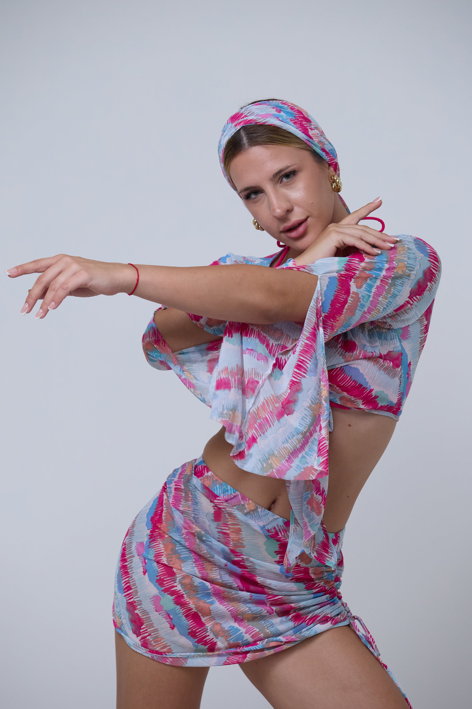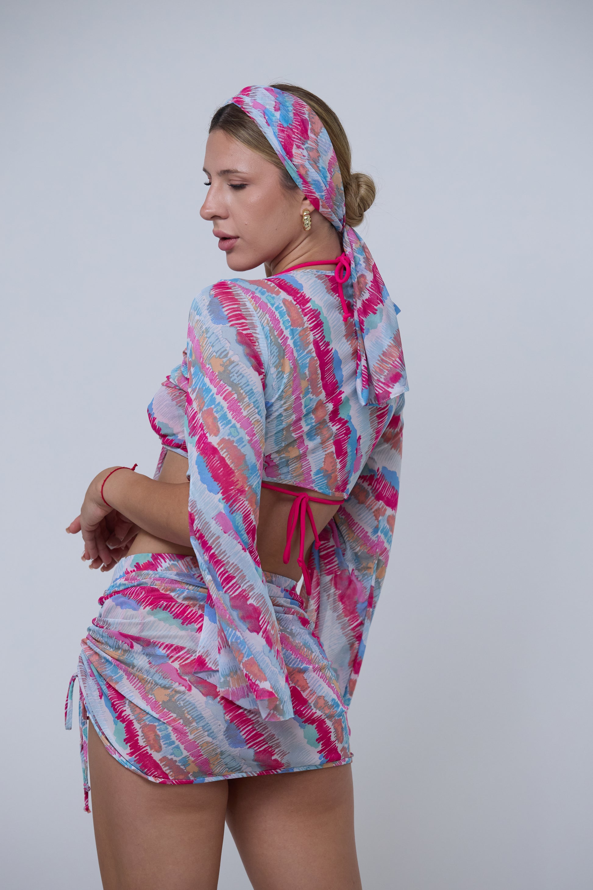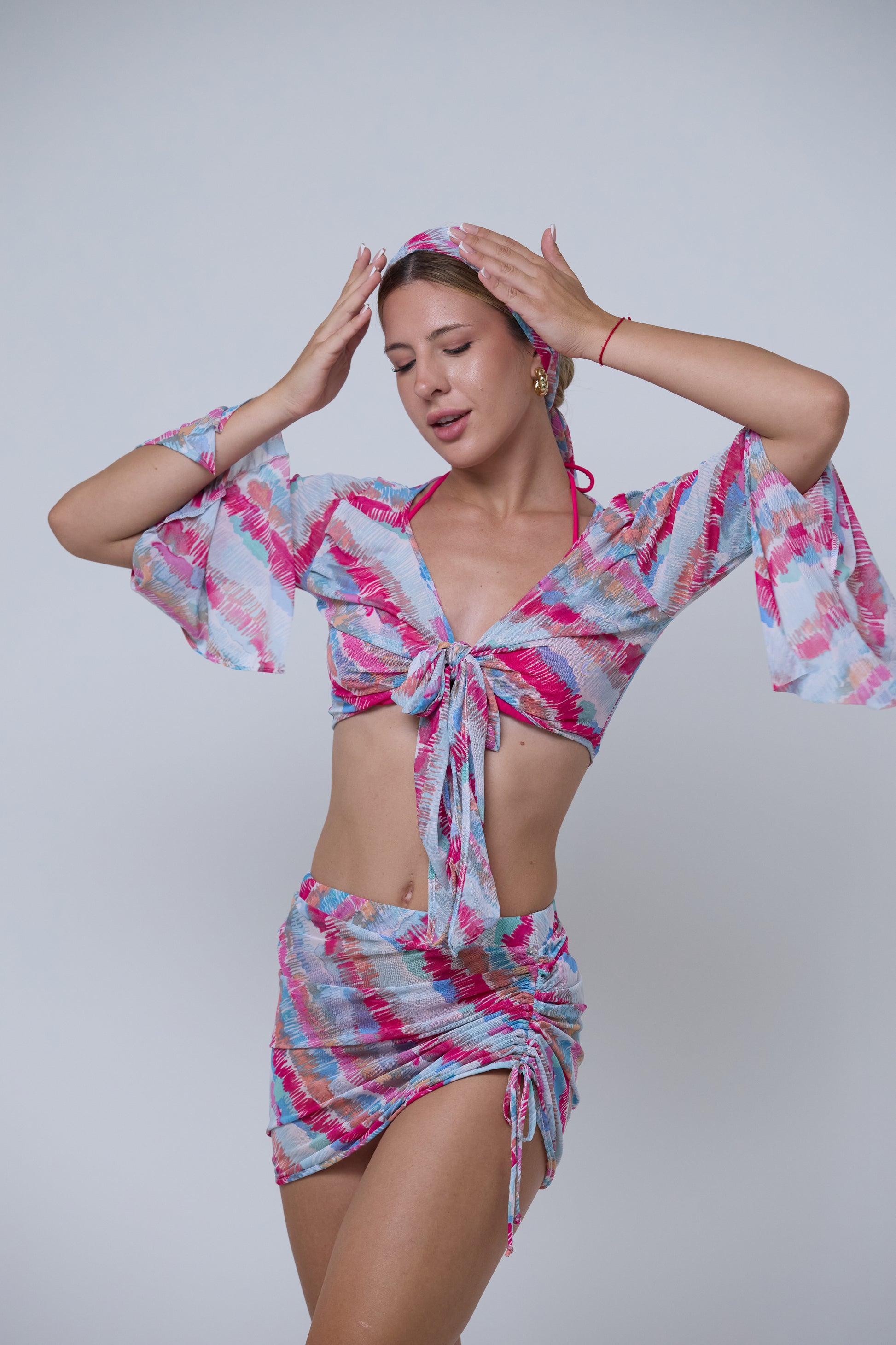 Lively and light — glowing with color. A three-piece cover-up set with a flared-sleeve tie top, ruched mini skirt, and matching headscarf — all in the vibrant Sunset Brush print. Designed to move with you from beach to golden hour.